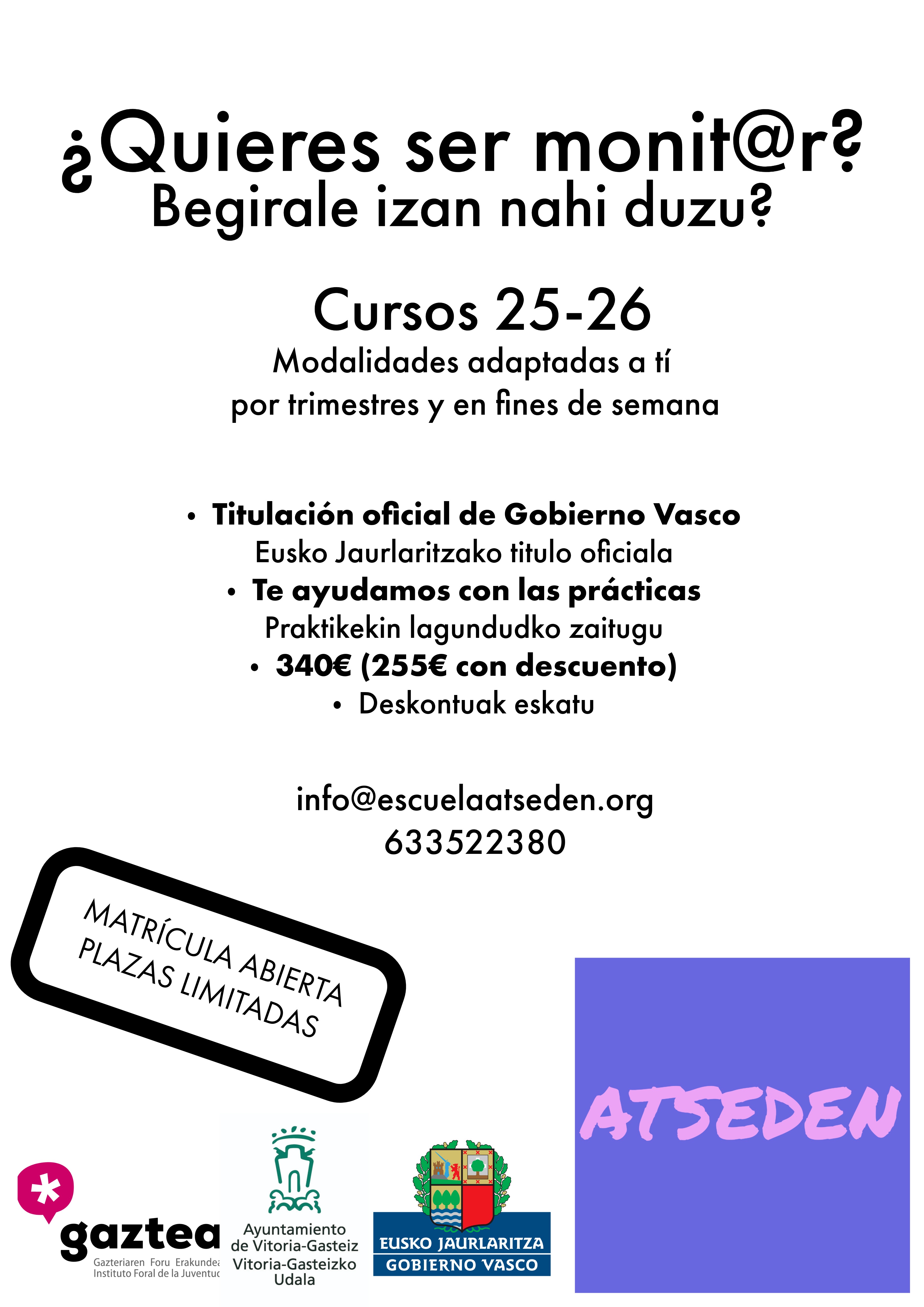 Consulta calendario, precios y descuentos en el 633522380 o escríbenos a info@escuelaatseden.org