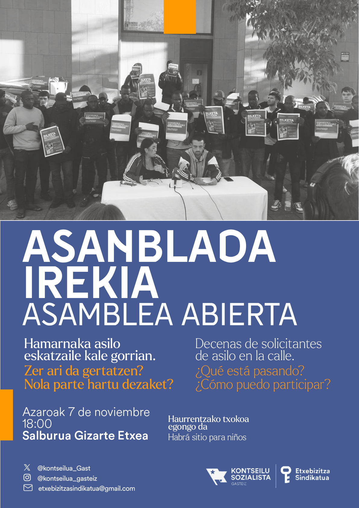 Para informar sobre la situación y poder participar en la dinámica hemos organizado una asamblea en el Centro Cívico de Salburua el 7 de noviembre (viernes) a las 18:00 horas. Además, celebraremos un día solidario en el barrio el 22 de noviembre.