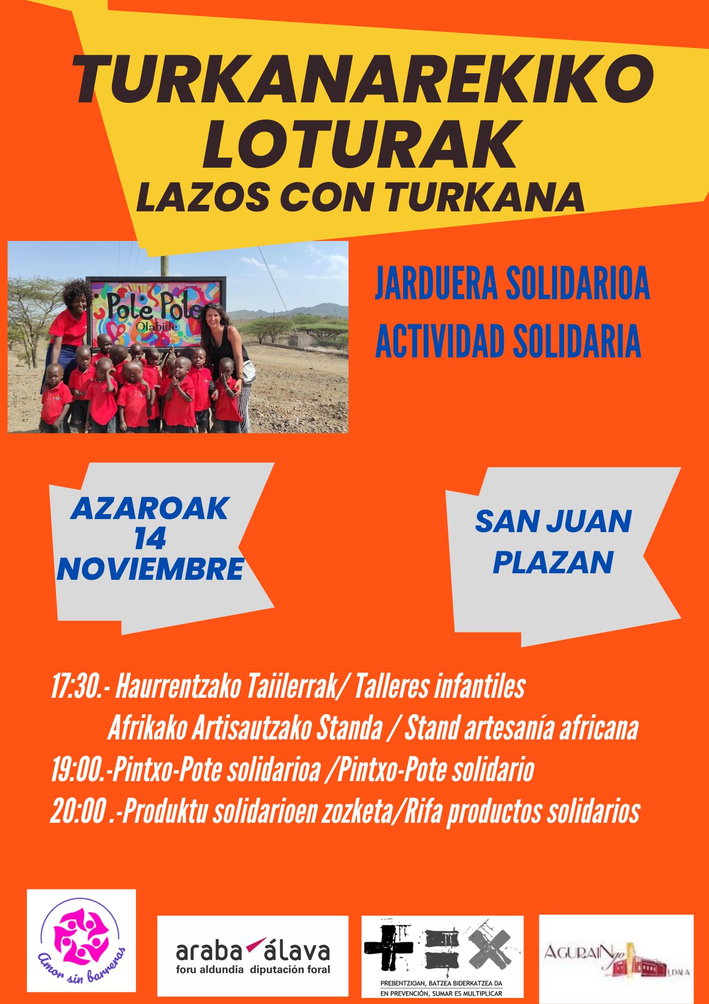 Dentro de la Semana Solidaria de Agurain y en colaboración con la Asociacion Amor sin Barreras, la Diputación Foral de Alava y el Ayuntamiento de Agurain, el dia 14 de noviembre, viernes, desde las 17:30 horas en la Plaza de San Juan, se realizarán diferentes actividades para recopilar fondos para el Proyecto Pole-Pole de Turkana.