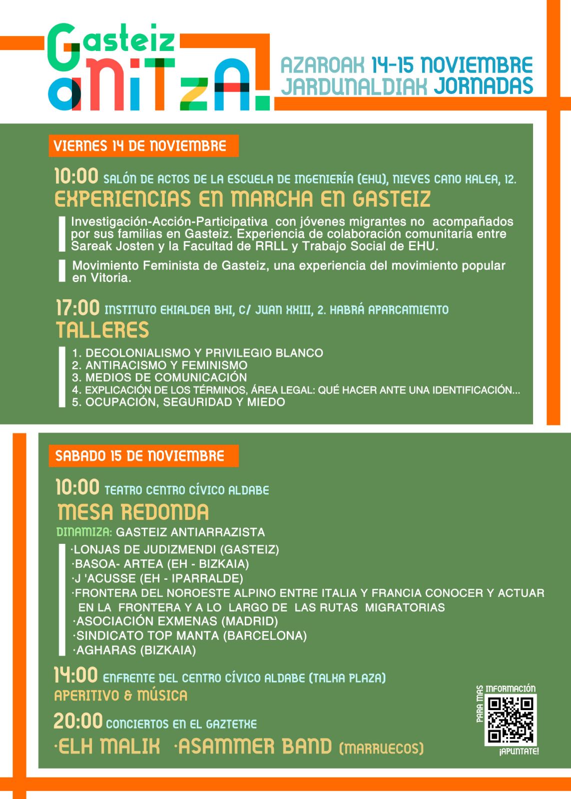 10:00 - Teatro Centro Cívico Aldabe Mesa Redonda: Gasteiz Antirrazista Con la participación de Lonjas de Judizmendi, Basoa-Artea, JAcusse, Frontera del Noroeste Alpino, Asociación Exmenas, Sindicato TOP Manta y Agharas